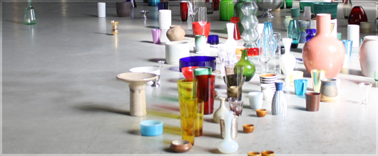 Für »Wasser «, eine zweite Arbeit, die auf der Empore installiert ist, hat Kris Martin zahlreiche ausrangierte Gefäße zu einem Ensemble zusammengestellt. Mit Wasser befüllt, balancieren die Objekte auf subtile Weise Vorstellungen über das Materielle und Immaterielle.