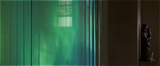 Da erstarrt ein Atemzug zu einer zarten Phiole. Da weckt das Video eines Betttuches, unter dem sich ein schlafender Mensch bewegt, zärtliche Erinnerungen. Da verweigert die Aufnahme des stobenden Nebels einer Wasserfontäne jede Tiefenschärfe. Und genau dort, wo das Unsichtbare zur Ahnung wird, wird man magisch in das Bild gezogen. Dabei ist stets Glas die durchsichtige Projektionsfläche, die dem Betrachter einen erweiterten Begriff von Vorstellung eröffnet, von den Welten hinter der Welt – etwa der in Glas gegossene Abdruck des zerwühlten Lakens, oder die kubistisch gebrochenen Scheiben, durch die „Staffelei“ und Raum hindurch scheinen. Bild, Zeit und Raum verschmelzen so zu einer Arbeit. Leuchtende Projektionen werden zu sinnlichen Erfahrungen, voll von zauberhaften Zwischentönen.
